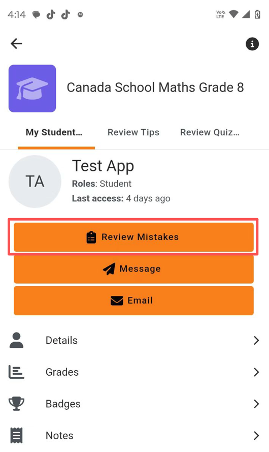 If you are already connected with your student, you can just choose your student and click "Review Mistakes" button to review their homework practices: