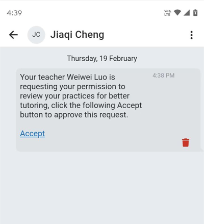 Then you can remind your student to click Accept button to accept your request, after that you will be connected with your student, and you can review their homework practices as the preview images.